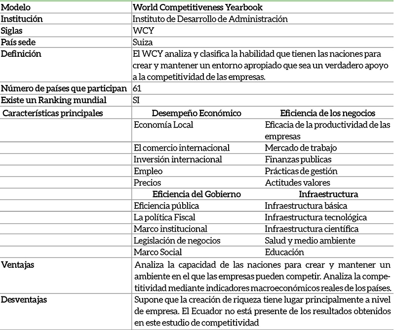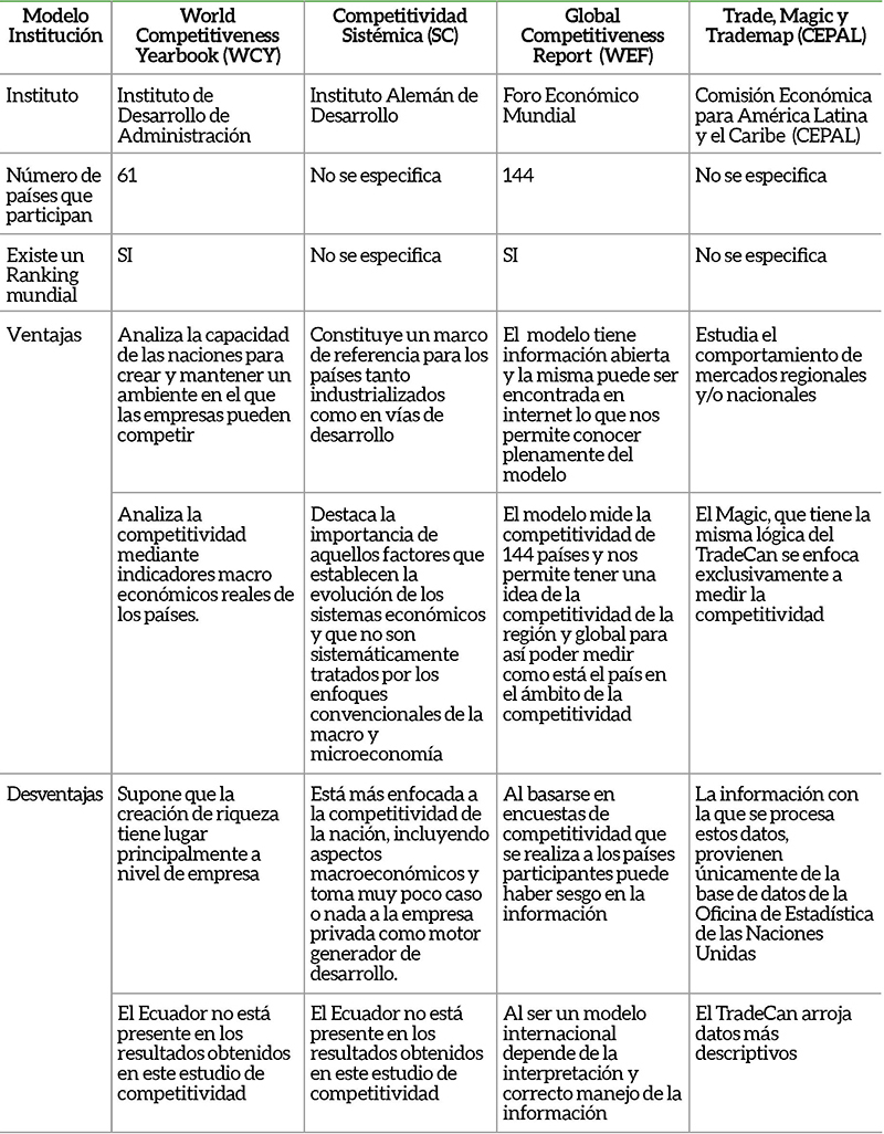 Se tomó como base los modelos descritos en el apartado 2.1.1., considerando que son los más uti- lizados a nivel mundial y Ecuador hace parte de algunos de ellos; el propósito es determinar cuál se ajusta mejor en la medida de la competitividad de los sectores seleccionados. Se realizó una compara- ción de las características, ventajas, desventajas de los modelos para obtener argumentos necesarios para seleccionar el modelo.