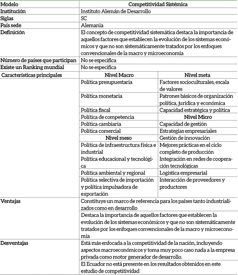 El Ecuador con la propuesta del Cambio de la Matriz Productiva desde el año 2008, y la defini- ción de los sectores priorizados de la economía, busca el mejoramiento de la competitividad sis- témica. En la tabla 2 se detallan las característi- cas, ventajas y desventajas de este modelo.