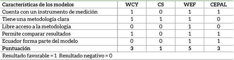 La matriz de comparación indica que el WEF es el modelo mejor adaptable al objetivo de investiga- ción, pues obtuvo una mayor puntuación, tanto por su fácil metodología, como por su libre acceso a la información y aplicación. Además, el modelo cuenta con la mayor participación de países; por otro lado, analiza información de datos duros, que se obtienen de los indicadores económicos del país como el PIB, el índice de endeudamiento, riesgo país, entre otros; también analiza criterios y datos llamados blandos, que tratan de acercarse de mejor manera a la realidad de cada país; entre los datos que maneja este modelo están, por ejemplo, la dis- ponibilidad de mano de obra, personal capacitado, etc. Estos datos no solo se pueden analizar a nivel país, sino también a nivel de cada sector; otra ven- taja es que esta metodología ya tiene un cuestiona- rio previamente definido, mismo que fue adaptado a la investigación en cada uno de los diferentes sec- tores involucrados.
