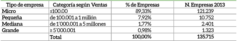 El Distrito Metropolitano de Quito (DMQ), se en- cuentra estructurado sobre la base del gobierno del Municipio de Quito. Una de las formas de definir la estructura empresarial del DMQ, es mediante las ventas totales anuales de las empresas, tomadas del último censo económico del año 2010, y en él se determina que el 89,20% del total de ventas corres- ponden a las empresas grandes (no consideradas como PYMES) y el 11,8% corresponde a las PYMES. En la tabla 7 se observa el número total de empre- sas del DMQ tipificadas según sus ventas globales.