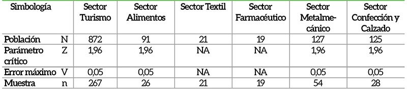 En la Tabla 10 se observa los elementos para el cálculo de la muestra. Para todas las industrias se consideró las empresas activas al momento de realizar la investigación. Para los sectores Textil y Farmacéutico se consideró a toda la población, puesto que su corto tamaño permite un estudio de toda la población.