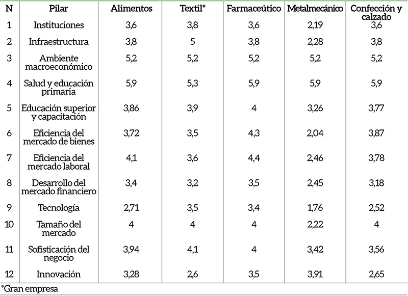 La Industria de bienes analizados en este estudio está constituida por los sectores: turismo, alimen- tos, textil, farmacéutico, metalmecánico y con- fección y calzado, el cálculo de competitividad se obtiene analizando los doce pilares y siguiendo la metodología detallada en el apartado 3.4; los resul- tados se evidencian en la tabla 11. Para el sector tu- rismo se analizan catorce pilares, tal como se mues- tra en la tabla 12.