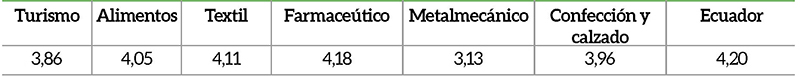 La mayoría de los sectores tienen una competitividad muy parecida a la del Ecuador (4,10), sin embargo los sectores que sobresalen son farmacéutico con 4,18 y textil 4,11.
