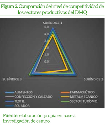 En la Figura 3 se presenta la comparación del nivel de competitividad de los sectores analizados del DMQ y del Ecuador.