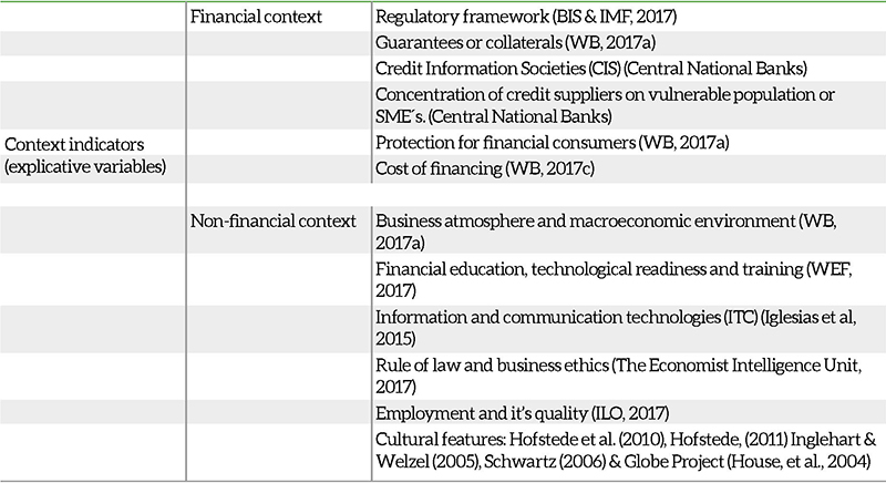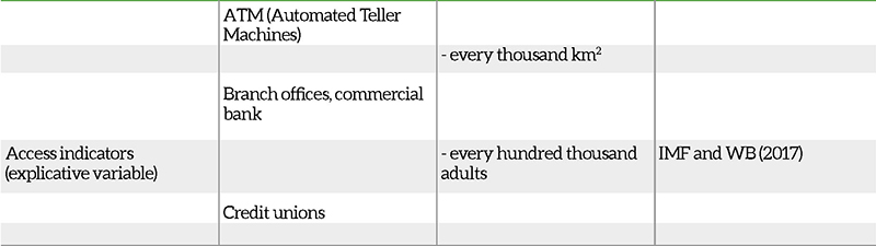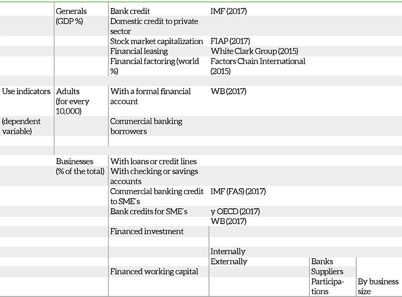 To study the determinants of financial inclusion it is required to choose the indicator that will represent it, and this has to do with the use of these services. Table 1 presents the main actual candidates available at this moment and their sources. The ones from World Bank (WB) and International Monetary Fund or IMF (WB, 2017b & IMF, 2017) stand out among others.