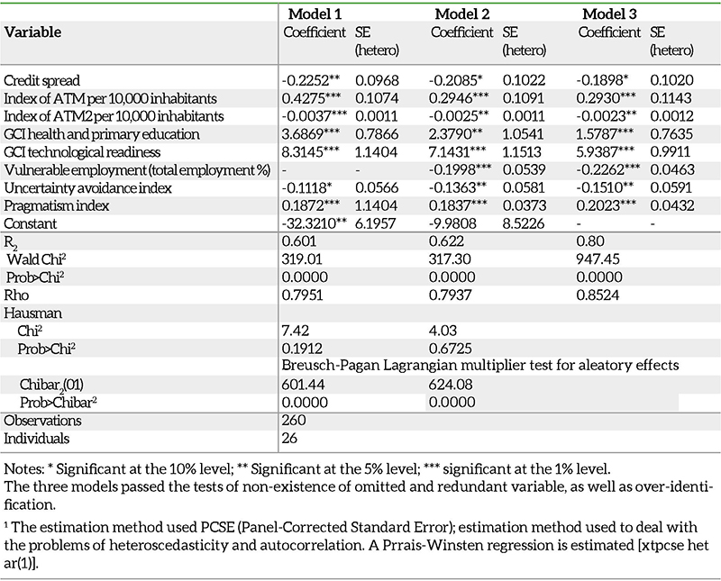 The quality of employment is more relevant for the financial access than the employment itself (Chen & Ravallion, 2012). Although, its correlation with health and primary education, suggests presenting three models where this variable or the constant are excluded. The purpose of this exercise is to avoid multicollinearity that the temporary component of the data base failed to correct, verify the significance of the vulnerable employment and, if according to principle of parsimony, it is justified to include it in the estimated panel. The robustness of the coefficients according to the scarce variability of its magnitude, significance or signs, as well as the greater explanatory power of the model when this element is included, allowed its validation (Gujarati, 2003).
