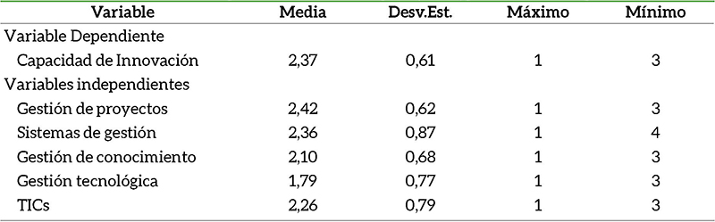 Otras variables: Incluimos cinco variables organizacionales para contrastar su efecto en la capacidad de innovación, a saber, gestión del conocimiento, las TICs, gestión tecnológica, sistemas de gestión y gestión de proyectos de innovación. Cada una de estas variables son medidas con una escala Likert.