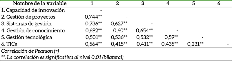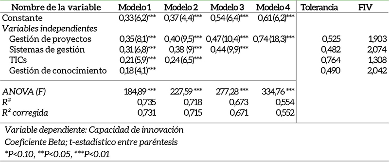 Las Tablas 4, 5 y 6 muestran los estadísticos descriptivos, la matriz de correlación, la estimación de los parámetros y las pruebas estadísticas para probar los efectos de la gestión de proyectos de innovación en la capacidad de innovación (Hipótesis 2), los efectos sobre la capacidad de innovación para aquellas PYMEs que cuentan con un sistema de gestión de proyectos de innovación (Hipótesis 3), los efectos en la capacidad de innovación de la gestión del conocimiento (Hipótesis 4), los efectos de la gestión tecnológica (transferencia de tecnología) en la capacidad de innovación (Hipótesis 5), y los efectos de las TICs en la capacidad de innovación (Hipótesis 6). Seguimos las sugerencias de Swamidass y Kotabe (1993), mediante el procedimiento de regresión denominado "pasos sucesivos" (stepwise).