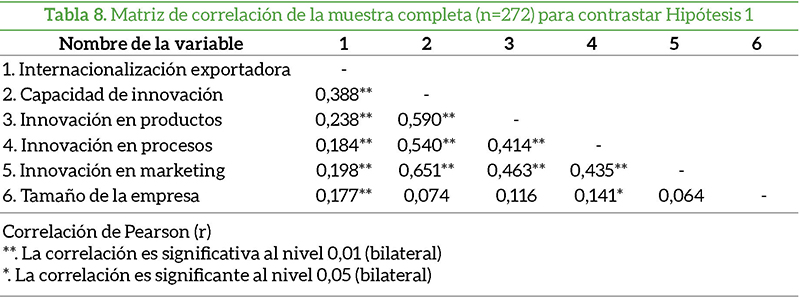 Tabla 5. Matriz de correlación de la muestra completa (n=272) para contrastar Hipótesis 2-6