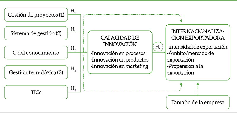 Medimos los efectos de la capacidad de la innovación en la internacionalización exportadora. Para ello, primero medimos los efectos de la gestión de proyectos, los sistemas de gestión, la gestión del conocimiento, las TICs y la gestión tecnológica sobre la capacidad de innovación. Nuestro modelo también considera el tamaño de la empresa como variable de control que influye en la internacionalización exportadora (ver figura 1).