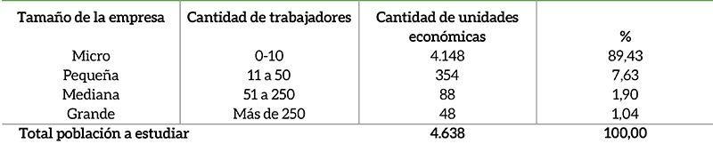 La Tabla 1 muestra la distribución de la población de estudio de manera disgregada por la cantidad de trabajadores y tamaño de la empresa. Cabe hacer hincapié que el criterio de clasificación considerado es el establecido en la Ley para el Desarrollo de la Competitividad de la Micro, Pequeña y Mediana Empresa en su artículo 3º, fracción III para las empresas industriales. Los datos mostrados fueron obtenidos del Directorio Estadístico Nacional de Unidades Económicas del INEGI. Se puede observar que el total de la población a estudiar compuesta por Pymes asciende a un 9.53% de todas las empresas manufactureras del Estado.