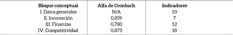 Adicionalmente a esto, se obtuvieron los coeficientes Alfa de Cronbach por cada uno de los bloques conceptuales para identificar que cada conjunto de indicadores mide lo que cada variable representa.