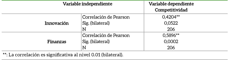 Se muestran datos de la relación de las variables independientes de Innovación y Finanzas con la variable dependiente de Competitividad.
