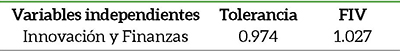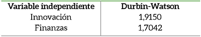 En la Tabla 3 el coeficiente de correlación de Pearson entre las variables independientes de Innovación y Finanzas obtiene valores p son igual o menores a 0.05 permitiendo descartar problemas importantes de linealidad entre las variables en cuestión. Las siguientes pruebas analizadas fueron las de independencia de los términos de error a través del estadístico de Durbin-Watson, cuyos resultados se muestran en la Tabla 4.