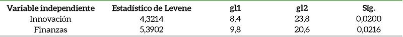 La Tabla 5 evidencia resultados que permiten aceptar el supuesto de homogeneidad de las varianzas entre las variables independientes de Innovación y Finanzas con la dependiente de competitividad.