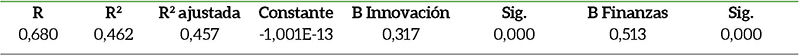 En la Tabla 7 se observan los valores de R2 y Beta en las relaciones entre las variables independientes innovación y finanzas y la dependiente competitividad, además se muestra el p-valor en donde se observa el grado de significancia de cada coeficiente Beta con un nivel de confianza del 95% (el procedimiento específico aplicado en el programa IBM SPSS v21 fue el de introducir todas las variables).