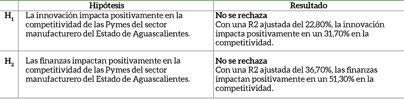 Como se observa en la Tabla 9, se aceptan las dos hipótesis, con lo cual se aprecia que los encargados directos de la administración de las Pymes de la industria manufacturera del Estadode Aguascalientes encuestadas consideran que la innovación y las finanzas impactan positivamente en la competitividad.