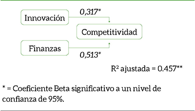 En el análisis de regresión múltiple se observan resultados que permiten establecer que, con un nivel de confianza del 95%, la R2 es significativa, además de que el valor del coeficiente Beta de las variables independientes de innovación y finanzas también resultó significativo, siendo la variable de finanzas la que explica mayormente el comportamiento de la variable de competitividad.