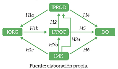 más un individuo u organización demuestra una comprensión más completa de la innovación, hay mayor propensión para alcanzar resultados (Kahn, 2018). Las innovaciones no tecnológicas (organizacional y marketing) son maneras de las empresas de innovar y aumentar sus divisiones de mercado (Pino et al., 2016). La innovación de productos tiene el significativo efecto sobre el desempeño innovador (Astuti et al., 2018). La IMKT tiene una relación positiva con el rendimiento y que IPROD tiene una relación positiva y significativa con el desempeño del mercado (Aksoy, 2017). La implementación de innovación de marketing aplicada aparentemente no logró aumentar el desempeño (Astuti et al., 2018). Si desea mejorar el rendimiento innovador, las empresas deben centrarse en las actividades de innovación de procesos, marketing y organización, en lugar de las actividades de innovación de productos (Tuan, Nhan, Giang, & Ngoc, 2016). De esta forma son presentadas las Hipótesis 4, 5 y 6.