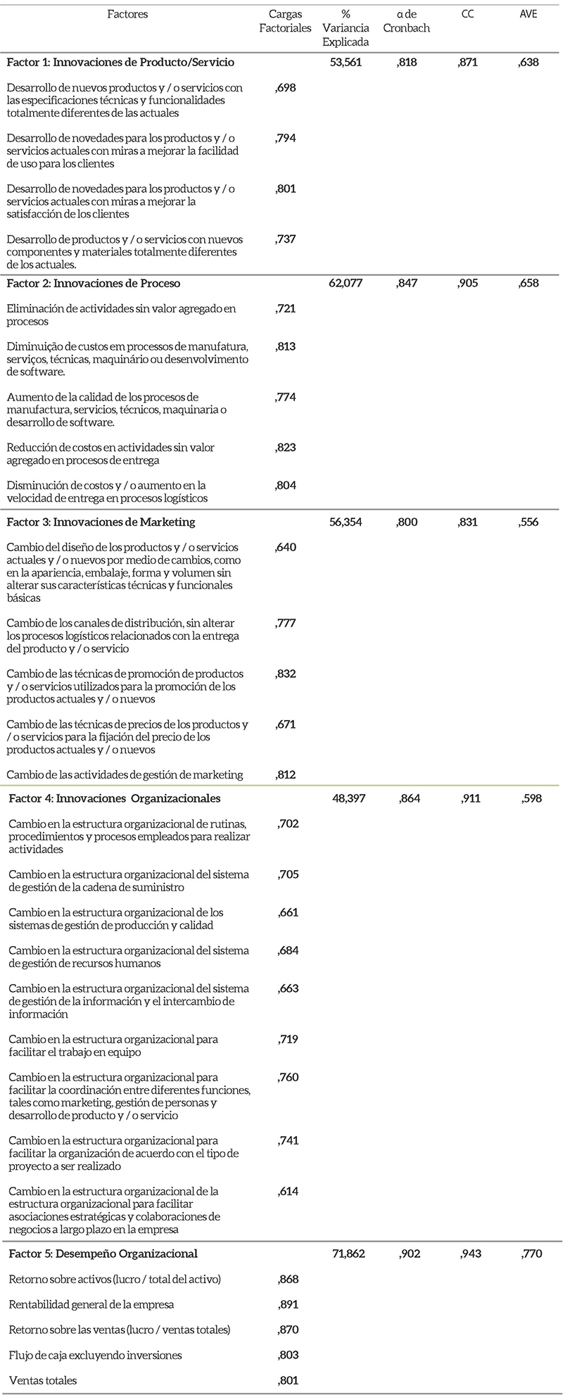 Para ejecutar la prueba del modelo teórico propuesto, se utilizaron escalas establecidas y probadas en otras investigaciones (Gunday et al., 2011). La escala sobre innovaciones de producto / servicios tenía como objetivo medir la frecuencia de la misma (1nunca y 5muy frecuente), las escalas utilizadas para medir las innovaciones de procesos en las empresas en los últimos tres años (1-nunca y 5muy frecuente), para medir las innovaciones de marketing en su empresa en los últimos tres años se usó la escala (1-nunca y 5muy frecuente), la medición de innovaciones organizacionales en la empresa en los últimos tres años (1nunca y 5 muy frecuente) y la medición del desempeño organizacional tuvo como objetivo analizar la posición competitiva de su empresa durante los últimos tres años en relación a ella misma considerando una escala donde (1bajo desempeño durante los últimos tres años y 5desempeño alto durante los últimos tres años).