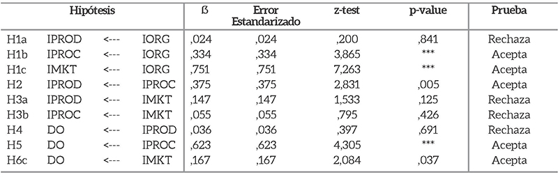Las innovaciones organizacionales mostraron una relación positiva con IPROC (H1b), demostrando que los cambios de estructura afectan directamente a los procesos organizacionales c. La IORG también tiene una influencia positiva para IMKT (H1c), esto confirma que a medida que se realizan innovaciones en las empresas, esto afecta positivamente las innovaciones de marketing (Chung & Kim, 2017; Gunday et al., 2011; Pino et al., 2016; Ulusoy et al., 2008)various papers investigate the effects of the technological (product and process.