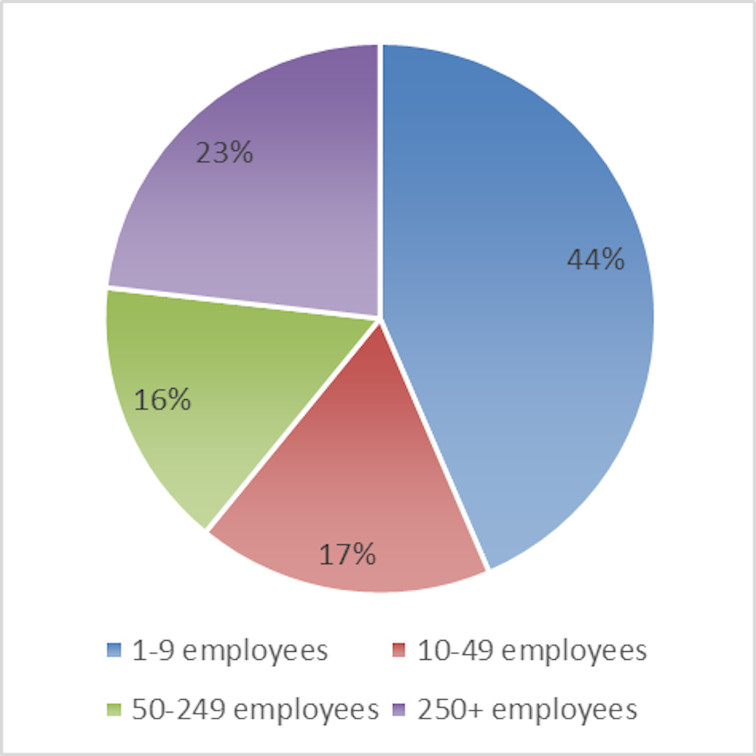 The majority (77%) of respondents are employed by SMEs. Companies having less than ten employees (“micro” enterprises) account for more than half of the employment within the SME category, followed by those with 10-49 employees (see Figure 1). This finding is consistent with the national statistical data (Statistical Committee of the Republic of Armenia, 2019, p. 13), according to which SMEs account for the majority of wage employment (68%) in the Republic of Armenia.