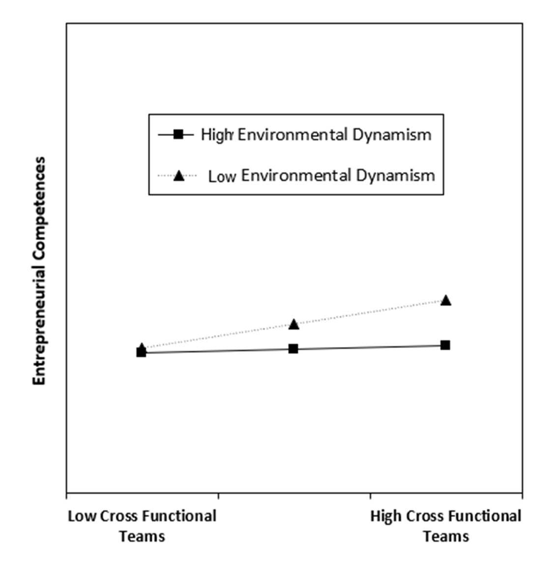 H5b: Environmental dynamism moderates the relationship between cross-functional teams and entrepreneurial competences, such that CFTs have a stronger positive effect on SMEs’ entrepreneurial competences when environmental dynamism is lower.
