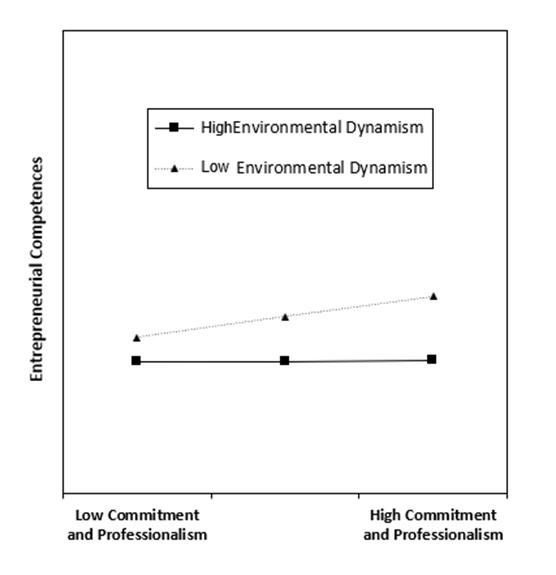H5a: Environmental dynamism moderates the relationship between organisational commitment and employee professionalism and entrepreneurial competences, such that commitment and professionalism have a stronger positive effect on SMEs’ entrepreneurial competences when environmental dynamism is lower.